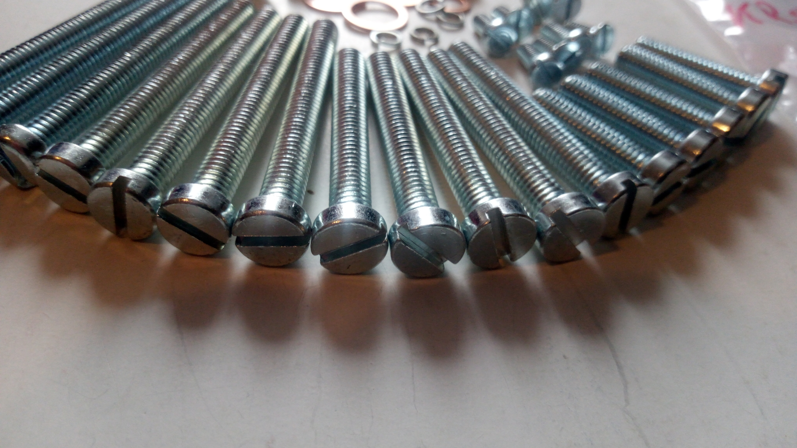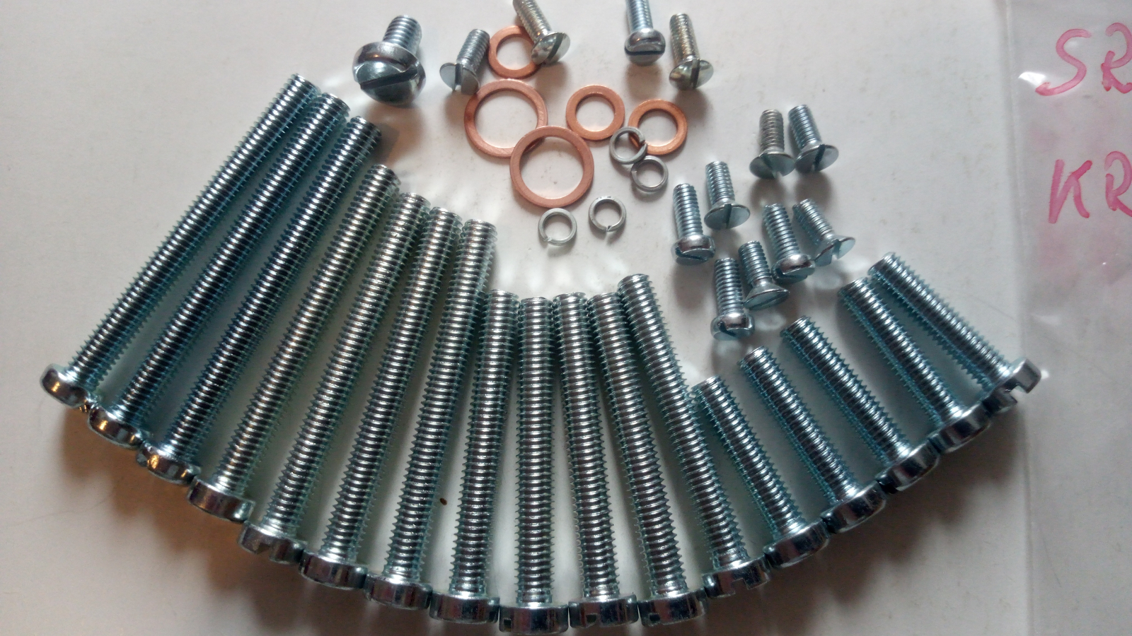 Schraubensatz für den Motor des SR2, Spatz und KR50. Der ca.40-teilige Satz ist sehr hilfreich bei der Regenerierung der entsprechenden Motoren. Dabei sind Schlitzschrauben, U-Scheiben, Kupferdichtringe usw.